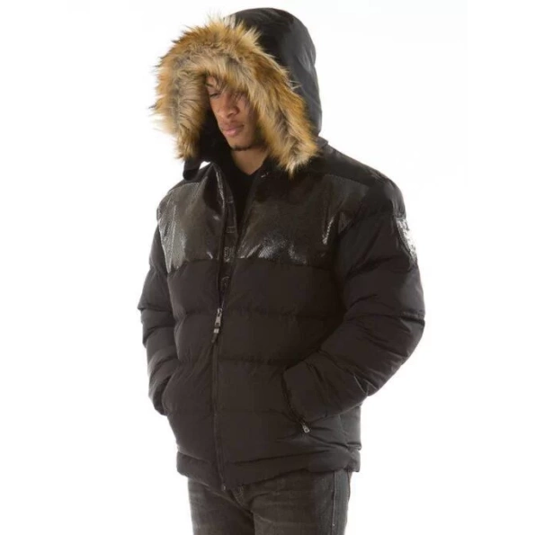 Black Snakeskin Puffer Jacket | Fur Hood Jacket