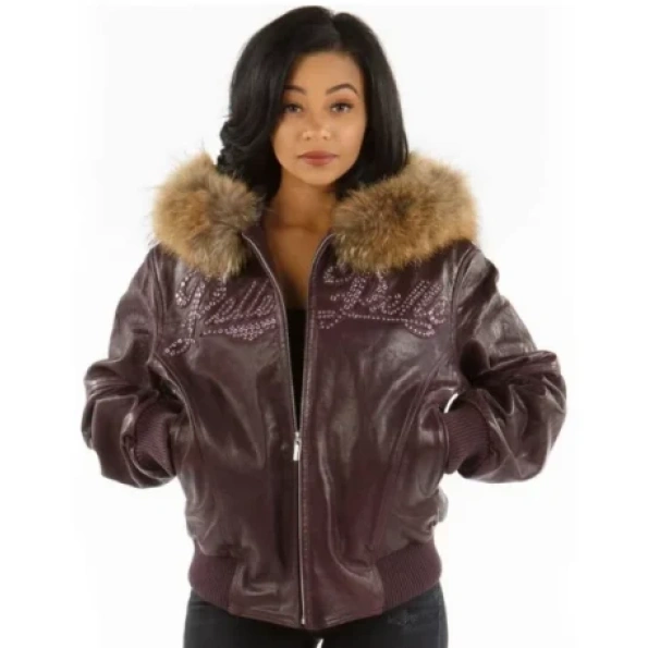 Burgundy Fur Hood Leather Jacket | Women Jacket