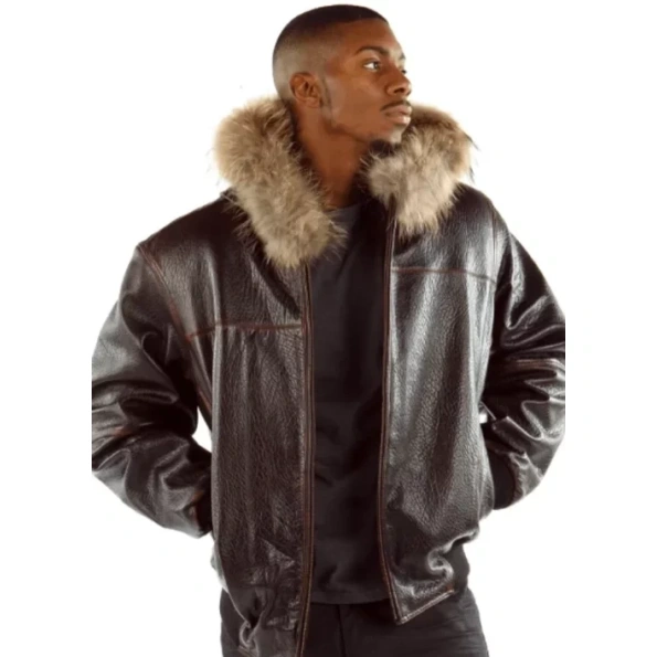 Men Dark Brown Scripted Jacket | Fur Hood Jacket