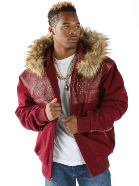 Men Red Wool Fur Hood Jacket | Studs Jacket