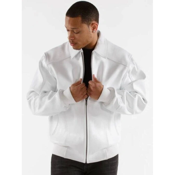 Men White Plain Leather Jacket