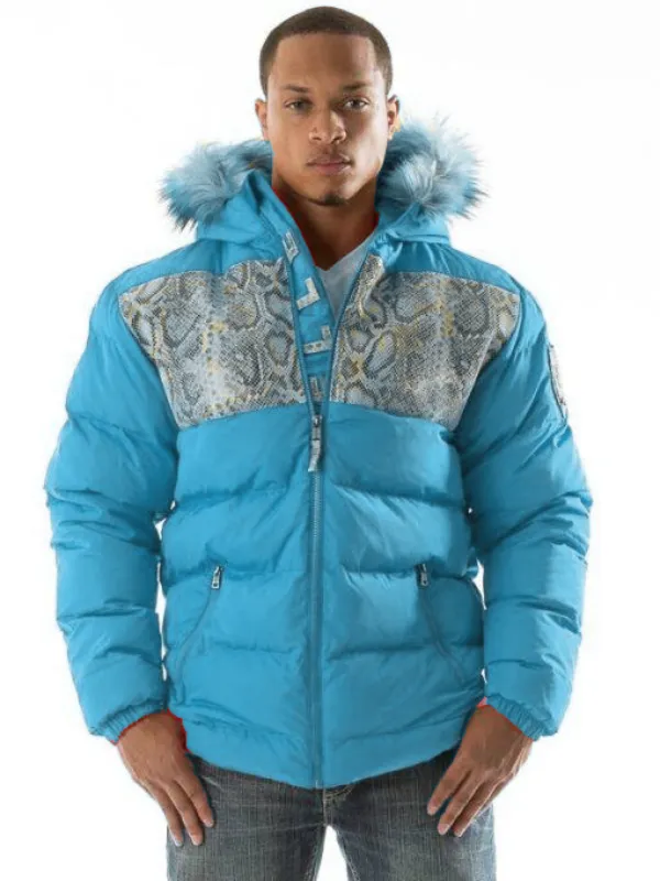 Snakeskin Fur Hood Blue Jacket | Puffer Jacket